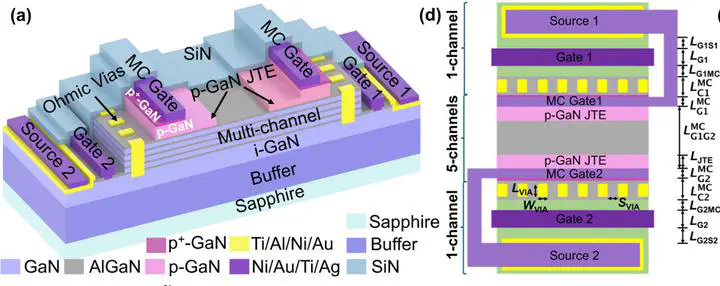 GaN multi-channel material has recently emerged as a promising platform for RF and power devices due to its high current capacity and low sheet resistance. Here we demonstrate, for the first time, a multi-channel GaN monolithic bidirectional switch (MBDS), achieving symmetric breakdown voltage (BV) up to 5 kV, specific on-resistance of 20 mΩcm2, and threshold voltage of 0.8 V in both voltage/current polarities. This BV is the highest reported in MBDS devices to date. This device is fabricated on a 150-mm 5-channel GaN-on-sapphire wafer and features a dual junction termination extension for electric field management. Enhancement-mode (E-mode) is achieved by a monolithic dual-cascode architecture, which integrates two low-voltage, single-channel E-mode HEMTs on either side of the multi-channel region. Furthermore, we evaluate the high-temperature reverse-bias (HTRB) reliability and dynamic …