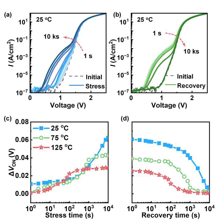 Ultra-wide bandgap (UWBG) NiO/β-Ga2O3 p–n junction has recently emerged as a key building block for emerging electronic and optoelectronic devices. However, the long-term reliability of this bipolar junction remains elusive. Here, the temporal evolution of the transient parametric shift is characterized in this junction under the prolonged forward- and reverse-bias stresses as well as in the post-stress recoveries. The temperature-dependent evolutions reveal the energy level and time constant of the dominant trap. The forward-bias stress is found to induce a negative turn-on voltage (VON) shift, the magnitude of which correlates with the stressed current density, while the reverse-bias stress leads to the opposite effect. Such VON shift is induced by an electron trap with an activation energy of 0.46 eV, which may originate from native point defects in β-Ga2O3 near the junction interface. Under a high forward current stress of 1000 A/cm2, device failure is found to be located at the edge region with the thinnest NiO, which is likely to be caused by the injection of hot electrons that diffuse across the entire NiO layer. Overall, the magnitude of parametric shift is approaching or comparable to those reported in the native SiC and GaN p–n junctions, suggesting that the NiO/β-Ga2O3-based UWBG devices have good potential to achieve a reliability comparable to their WBG counterparts.