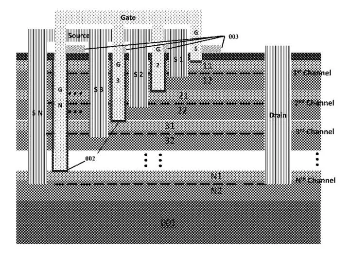 A semiconductor device includes a layered structure forming multiple carrier channels extending in parallel at different depths of the semiconductor device and a gate electrode having multiple gate fingers of different lengths penetrating the layered structure to reach and control corresponding carrier channels at the different depths. The semiconductor device also includes a carrier electrode having multiple carrier fingers of different lengths penetrating the layered structure to access the corresponding carrier channels. The carrier fingers are interdigitated with the gate fingers.