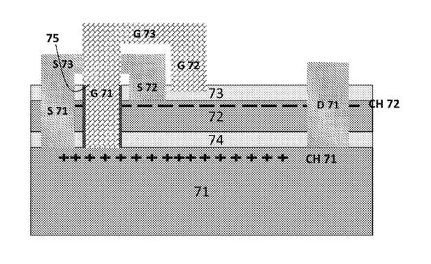 A semiconductor device includes a layered structure forming multiple carrier channels including at least one n-type channel formed in a first layer made of a first material and at least one p-type channel formed in a second layer made of a second material and a set of electrodes for providing and controlling carrier charge in the carrier channels. The first material is different than the second material, and the first and the second materials are selected such that the n-type channel and the p-type channel have comparable switching frequency and current capability.